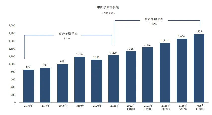 近年來,隨着中國人均可支配收入的提高,人們的消費水平和健康意識也不斷增強,消費者關注的焦點逐漸從“吃得飽”轉向了“吃得好”、“吃得健康”,由此推動了中國水果銷量不斷攀升。根據弗若斯特沙利文數據,中國水果零售市場規模已由2016年的8273億元增長至2021年的12290億元,複合年增長率為8.2%。