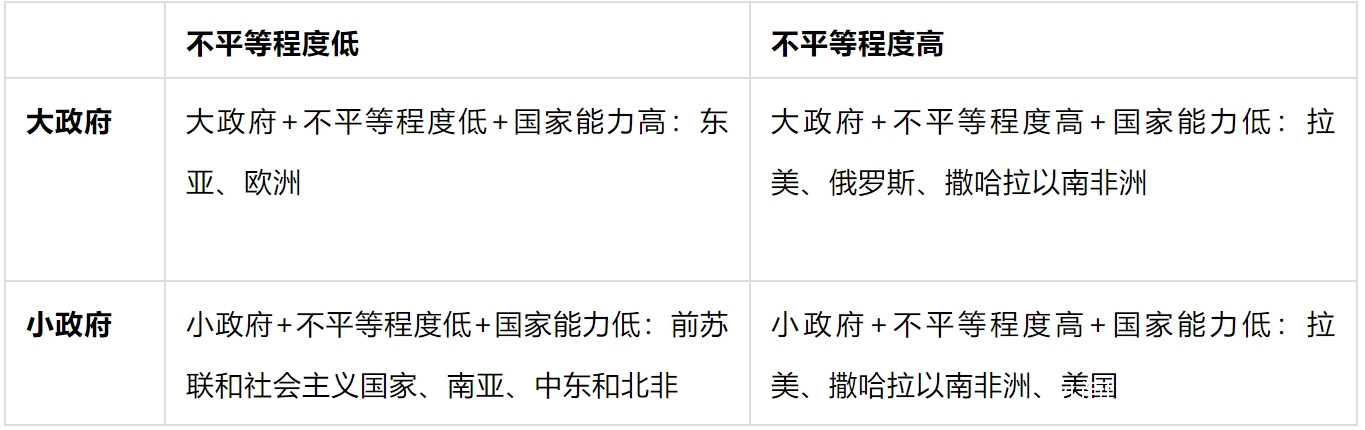 (1)低不平等,強制度能力國家(例如發達國家和部分東亞、中東、北非國家);