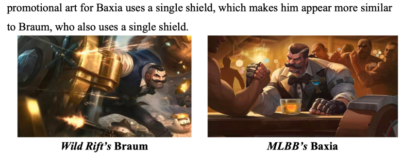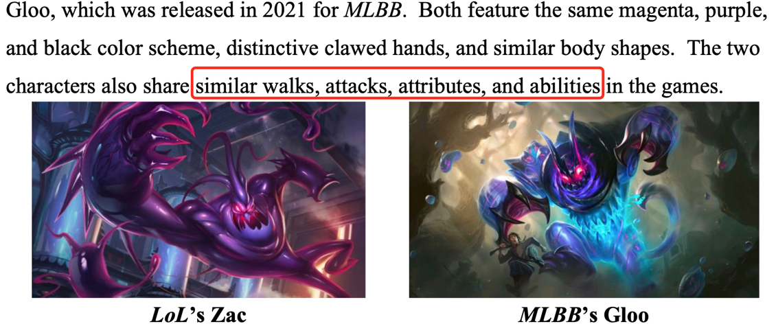 英雄角色設計方面,拳頭公司指出《無盡對決》2021年上線的英雄“Gloo”,與《英雄聯盟手遊》在2013年上線的英雄“扎克”在原畫、遊戲動作以及技能上都高度相似,其中,Gloo採用了與扎克一致的配色方案(品紅、紫色、黑色)、爪手和身型,此外遊戲動作及技能也極其相似。