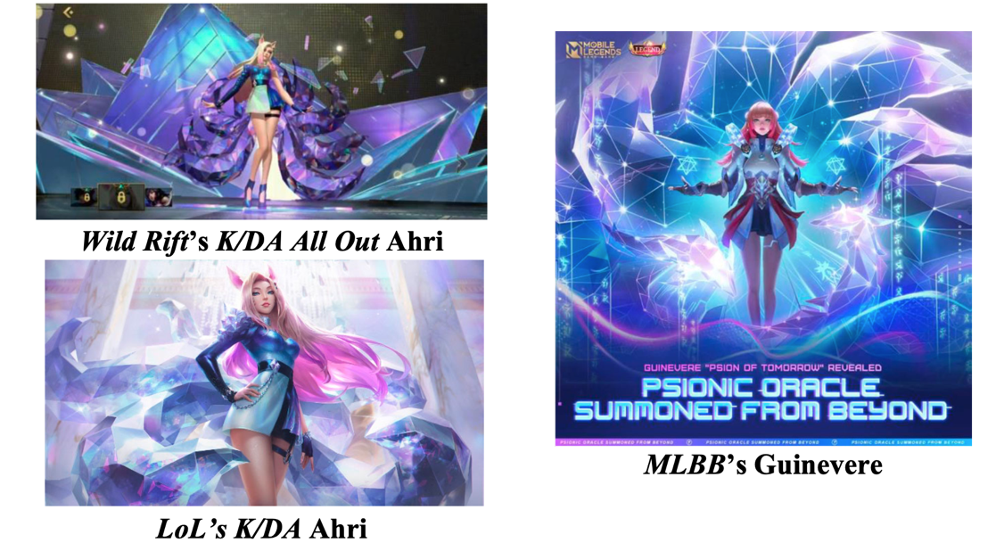 英雄皮膚“K/DA阿狸”於2018年11月上線《英雄聯盟》,2020年10月上線手遊,《無盡對決》則是在2022年4月上線皮膚“Psion of Tomorrow·Guinevere”, 拳頭公司指出兩者的配色方案(亮藍色與紫色)、武器(紫色水晶狐尾)相差無幾,此外兩個角色在遊戲裏的技能與屬性也非常相似。
