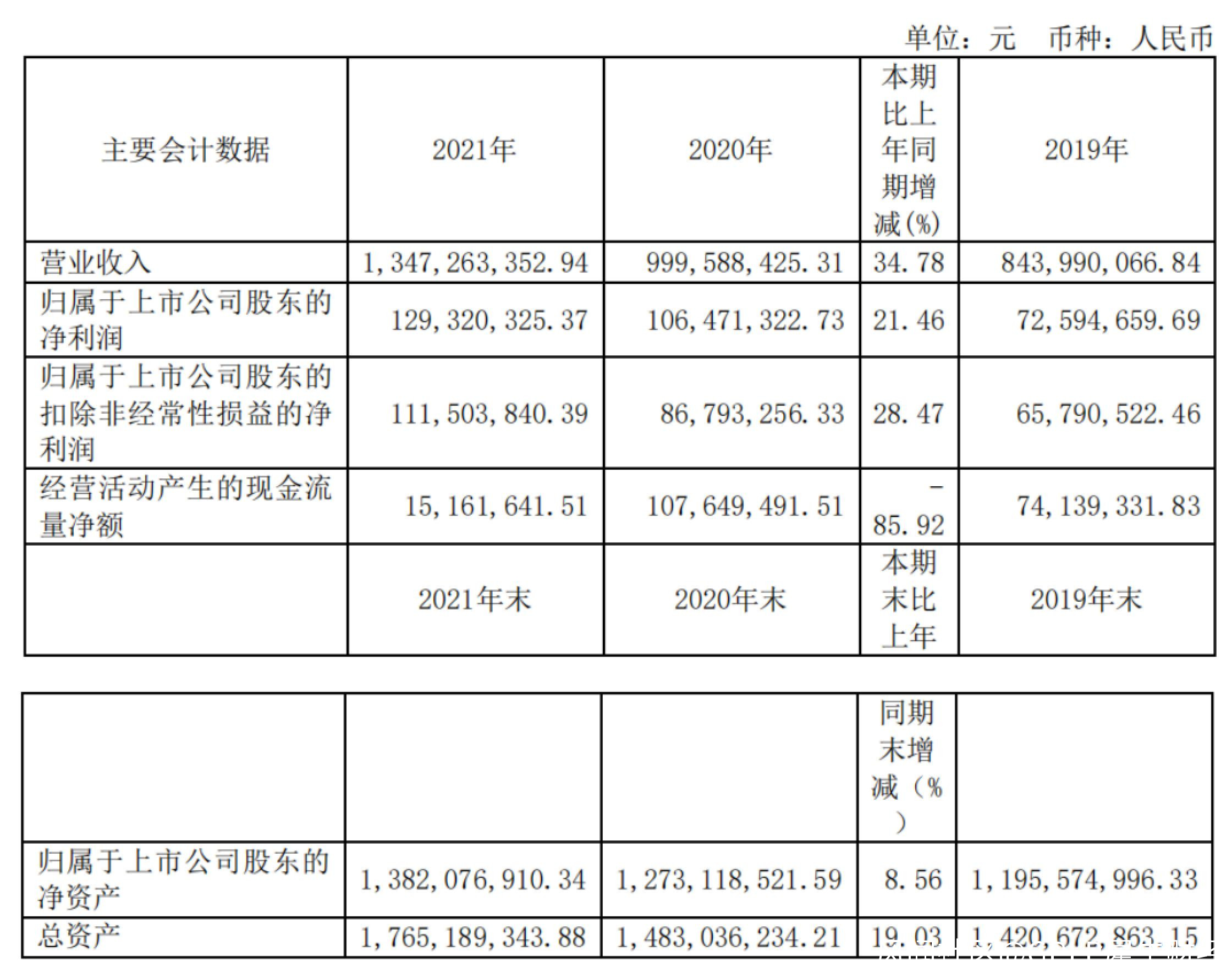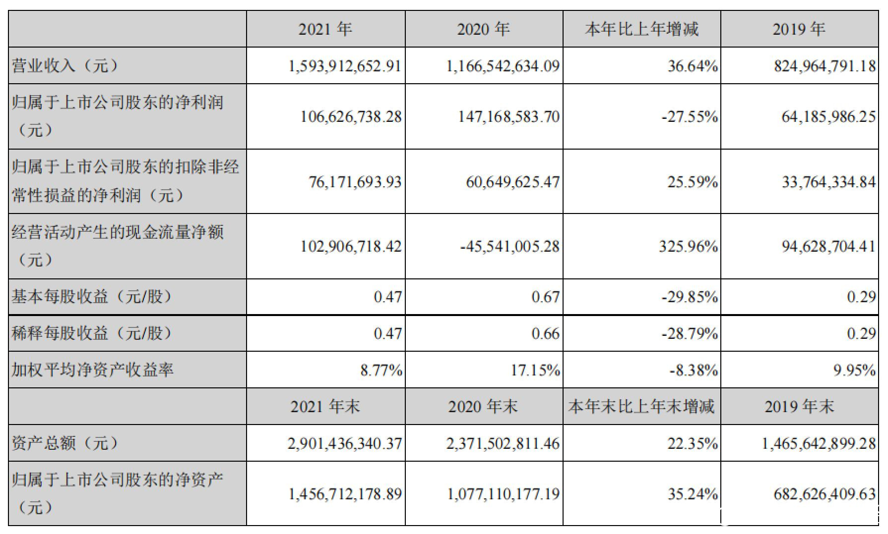 2021年度公司實現營業收入約6.87億元,較去年同期增長 62.57%;歸屬於上市公司股東的扣除非經常性損益的淨利潤為0.91億元,較去年同期增長54.81%;歸屬於上市公司股東的淨利潤為1.25億元,較去年同期下降 18.77%。