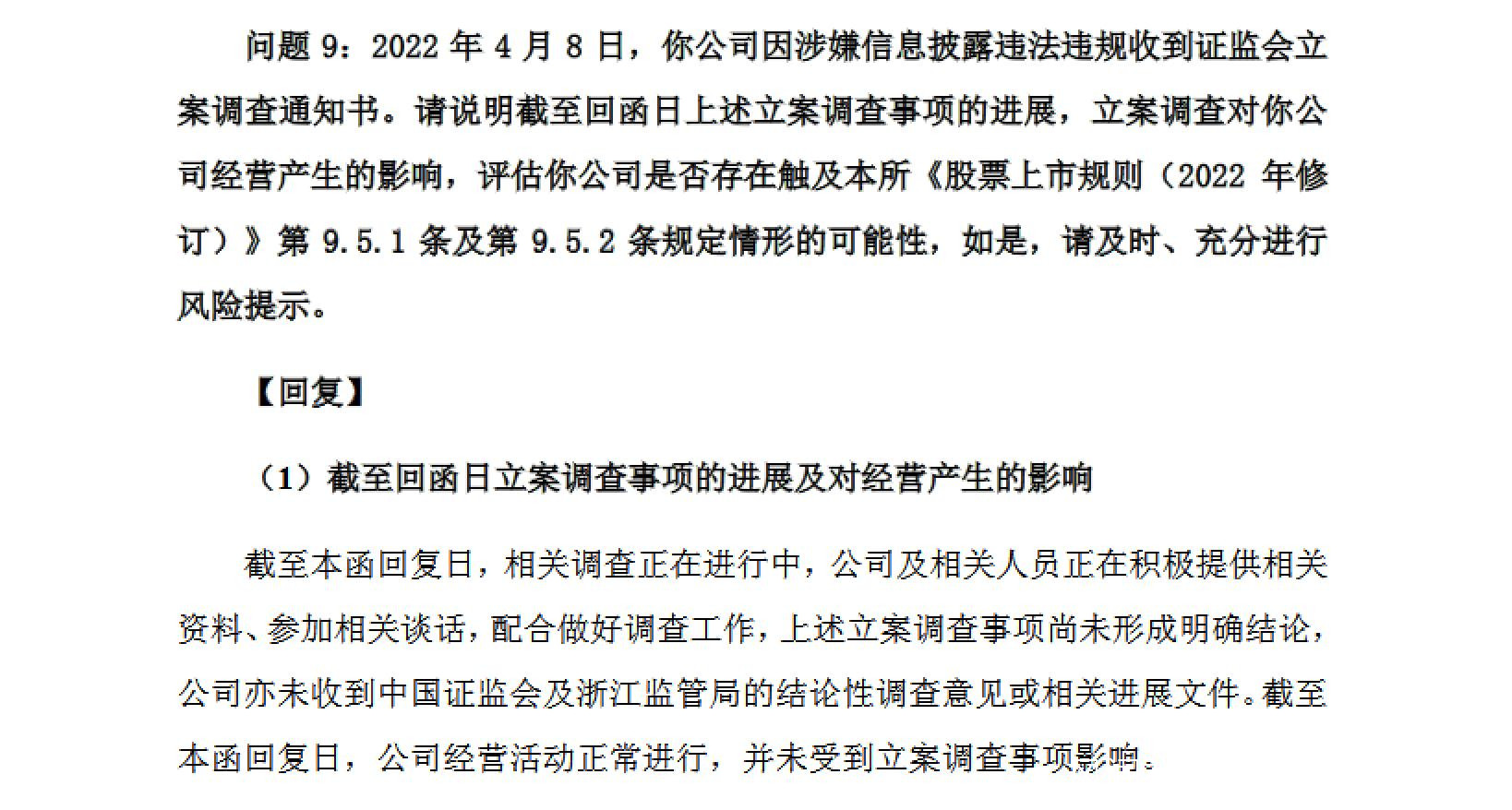 4月8日,金字火腿因涉嫌信息披露違法違規被中國證監會立案調查。對於本次案件的最新進展以及立案調查對經營產生的影響,金字火腿稱,上述立案調查事項尚未形成明確結論,亦未收到中國證監會及浙江監管局的結論性調查意見或相關進展文件。截至目前,該公司經營活動正常進行,並未受到立案調查事項影響。