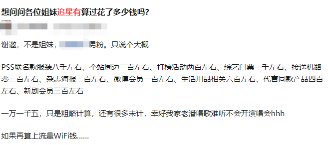 在2020年以前,按照追星頂配來算,如果追的是歌星,一張演唱會VIP的門票票面價1680人民幣,熱門一點的翻三到五倍也能買到一個好位置,往返路費+酒店費用+票錢+應援物資,一趟小一萬就沒了。