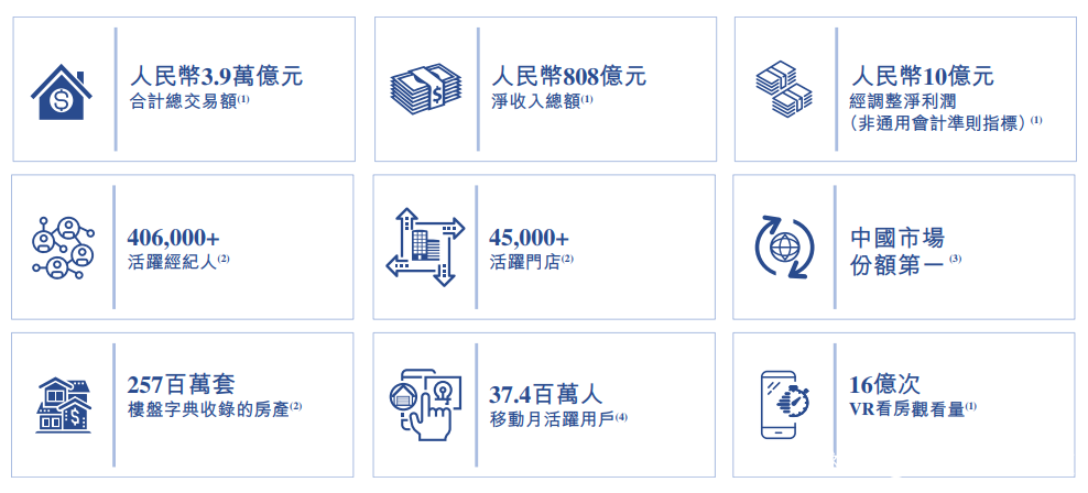 貝殼是國內領先的在線線下一體化房產交易和服務平台。於2021年,公司的平台完成了超過450萬筆房產交易,合計總交易額達到人民幣38,535億元。根據灼識諮詢報告,按總交易額計算,公司是中國最大的房產交易和服務平台,同時也躋身全球前三大商業平台之列。