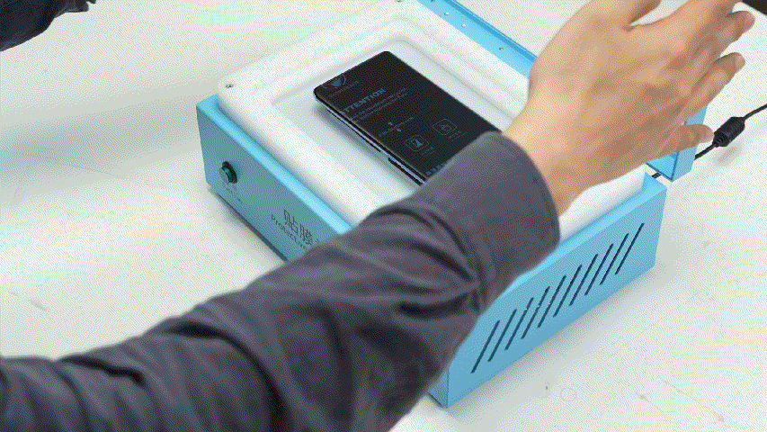 這玩意可以通過壓縮空氣帶動上方的薄膜給手機屏幕來一次全方位的按壓,從而讓膜能完整的吸附在曲面上,當然如果沒貼膜神器,你用手按也行。