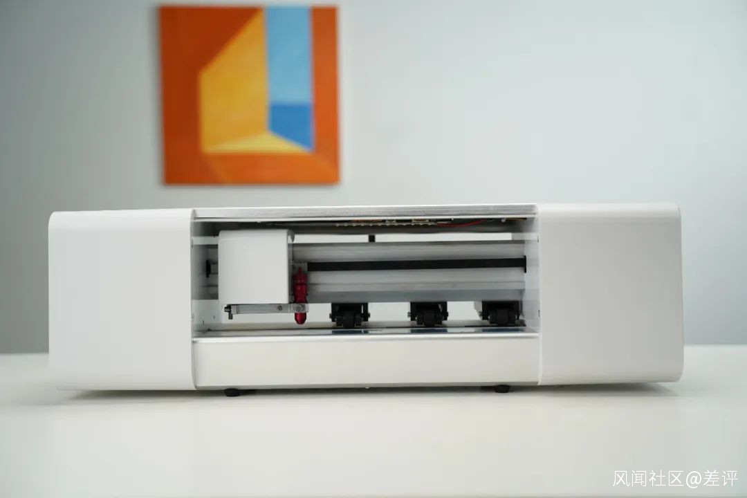 這台裁膜機説白了就是一個小型機牀,它的工作原理就是通過滾輪把手機膜捲到操作枱,然後控制刀頭將膜切成特定的尺寸,最後再把膜給卷出來。