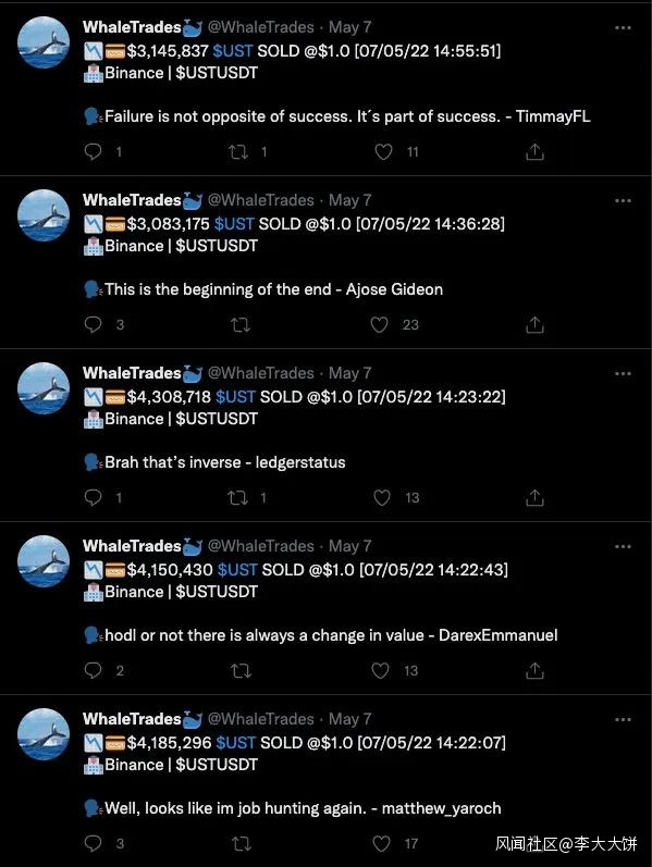 從 5 月 7 號開始,突然有資金在大幅拋售 UST,這些拋售都是數千萬數百萬美元的級別。