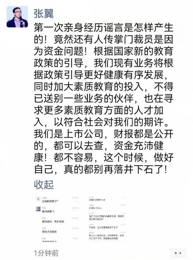 不過,從回應來看,張翼並未否認裁員一事,而是在強調掌門教育裁員是因為轉型,並非資金問題。換言之,掌門教育裁員是真,業務收縮調整也是真,只是尚不至於退租倒閉。