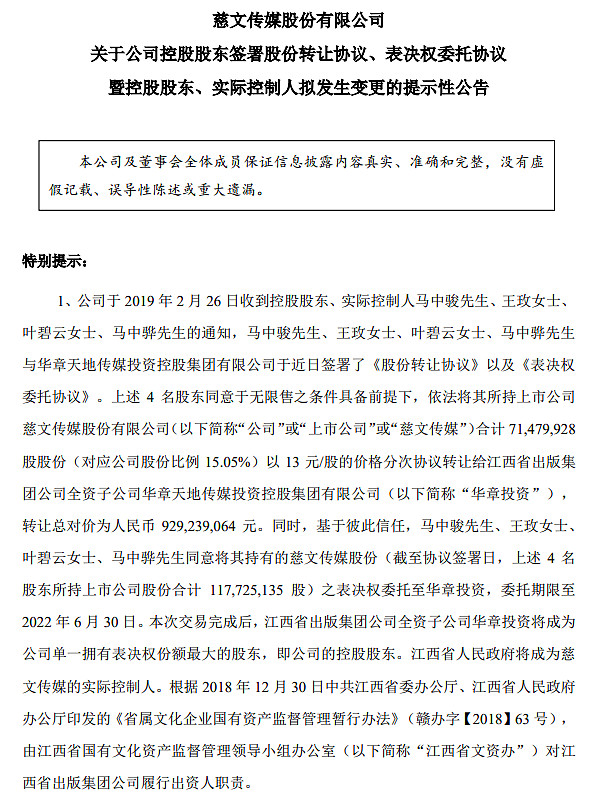 2018年,公司實現營業收入12.69億元,同比減少23.81%;歸屬於上市公司股東的淨利潤為-10.84億元,同比減少365.48%。鉅虧之後,2019年國資公司華章投資接手了慈文。