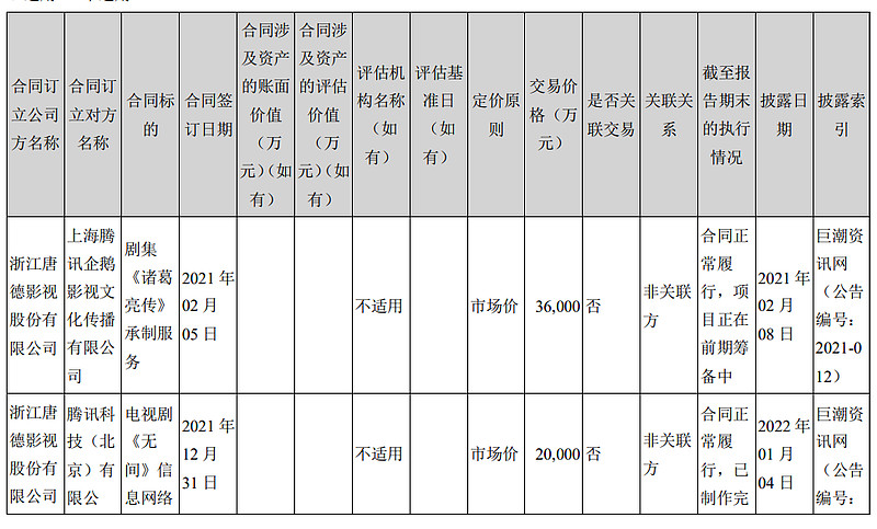 在慈文傳媒的財報中,年度第一大銷售客户為愛奇藝,銷售額3.6億元,主要銷售項目為《風暴舞》及老劇多輪發行,在2022年即將上線的15部作品中,有7部將在愛奇藝播出;歡瑞世紀在2021年與阿里巴巴簽訂了3部劇共5.9億的製作合同,與愛奇藝簽訂了2部劇共6億的製作合同;唐德接下來也要為騰訊拍攝兩部定製劇《諸葛亮傳》《無間》,交易價格分別為3.6億與2億。