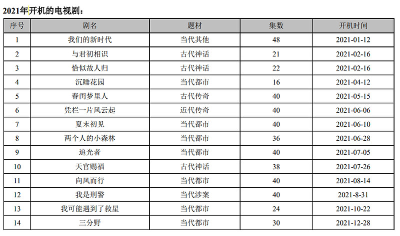 “古裝大IP+流量”一度是華策的金字招牌,比如近些年的《三生三世十里桃花》《孤芳不自賞》《天盛長歌》《有翡》等古裝劇。但隨着古裝偶像劇播出收緊,早在2019年半年報中,華策就表示“為積極應對行業變化、為下一輪高質量發展做好準備。”在近兩年開機的劇裏,每年古裝劇佔比不足30%。