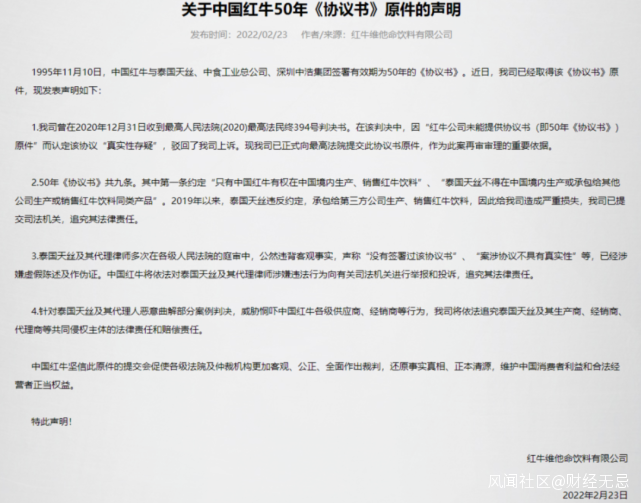 中國紅牛多次發佈聲明稱,中國紅牛在創立之前與泰國天絲、中國食品工業總公司、深圳中浩集團等簽署期限為50年的《協議書》是其憲章性文件,中國紅牛認為,該協議是中國紅牛中泰企業開啓合作的前提和關鍵性法律文件,也為“紅牛”品牌在中國市場創建和發展奠定了堅實的基礎。因為生產許可和商標註冊都是中方企業解決的。
