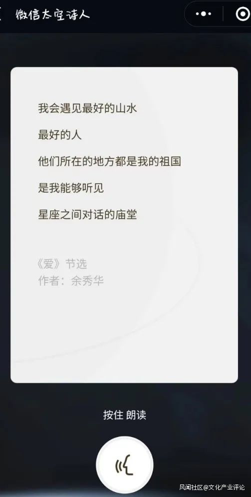 **最後,來自太空旅行的浪漫也並不侷限於真人的真實體驗。**比如騰訊新聞曾開展航天年主題策劃,開展航天科普欄目,讓用户通過掃描二維碼查收來自太空的明信片;微信也曾推出“微信太空詩人”小程序,向用户徵集詩歌語音,並由長征四號乙火箭將詩歌聲音帶上太空。