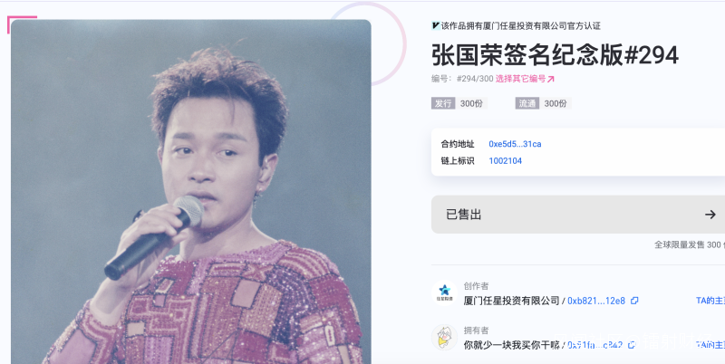 iBox推文中未説出“摯愛好友”的具體身份,目前iBox微信公眾號已被封禁。據公開信息,張國榮公益數字藏品的發行商為廈門任星投資有限公司(簡稱:任星投資),該公司創建於2020年,是一個致力於通過區塊鏈技術賦能實體經濟的投資機構。