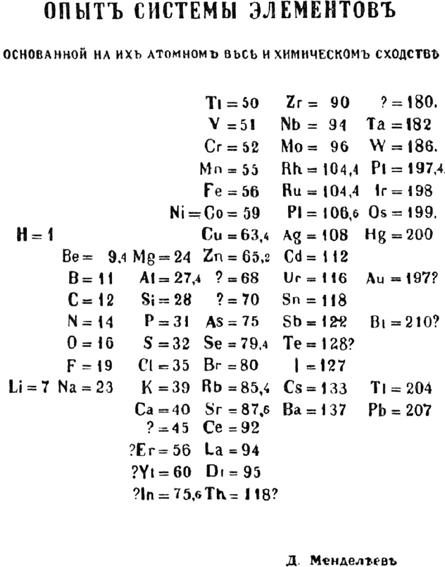 1869年出版的門捷列夫元素週期表是一張垂直的圖表,按原子量排列了63種已知元素,這種排列將性質相似的元素放在了同一水平行上。圖表名稱意為“基於原子量和化學特性的元素體系草圖”。
