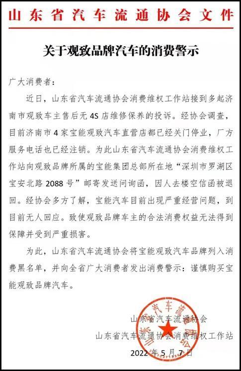 山東省汽車流通協會表示,經協會多方瞭解,寶能集團旗下寶能汽車目前出現嚴重經營問題,到目前無人回應,為此,協會將寶能觀致汽車品牌列入消費黑名單,並警示消費者謹慎購買觀致品牌汽車。