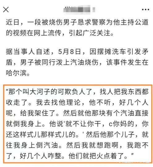 不止如此,曹某濤去世之前還留下段遺言,説自己是被燒死的,潑汽油和點火的都是名為大河子這人的兒子乾的。