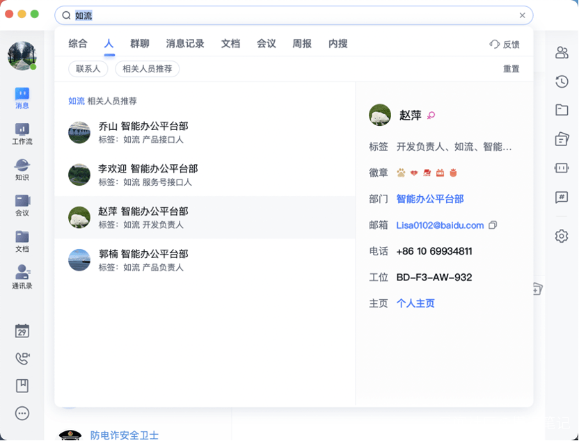 智能搜索包含“統一搜索”、“以文搜圖”、“以事找人”等功能:其中統一搜索,既可以搜得“精”也可以搜得“全”。比如,我在如流中搜索公司同事“張磊”,可得到與“張磊”相關的羣聊、消息記錄、內搜情況、工作文檔、甚至個人的週報與OKR等各種具體場景下的不同類型信息,結果精準又全面。