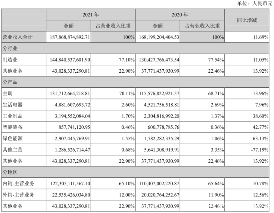 分業務來看,格力核心業務空調產品實現銷售收入1317.13億元,同比增長13.96%,基本盤保持了穩健的增長;生活電器實現銷售收入48.8億元,同比增長7.96%。