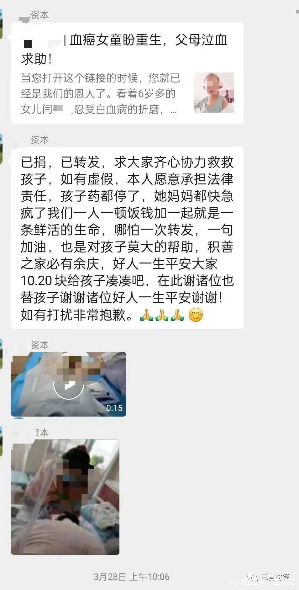 比如5月5日,“xx資本”在羣裏發求助鏈接為一位患幼年型單核白細胞白血病的孩子籌款,文案內容為“這是我公司員工的孩子,隨時都有生命危險”。同時還發了孩子的照片和視頻,圖中可見孩子是短髮,身穿黃色衣服;