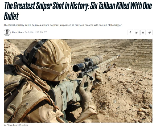 比如2014年年初在阿富汗南部,一名英國狙擊手手持L115A1(AWM的英軍版本),看到一名敵人身上綁着疑似自殺式爆炸背心,於是在850米外果斷開槍,八成是撞了狗屎運,子彈命中了爆炸背心的雷管。背心爆炸還炸死了這名武裝分子周邊的5個夥伴,可謂創造了狙擊手歷史上的6殺記錄。
