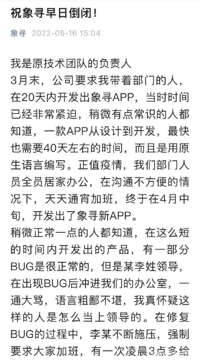 文章稱,自己是象尋科技原技術團隊負責人。3月末,當事人帶部門人員通宵加班,開發出了象尋新App。超額完成任務後,在修改BUG過程中,遭到某領導辱罵,並強制大家加班。一次當事人在凌晨3點多收到了領導的電話並被指責。4月末,團隊被要求新增一些App新功能,但領導要求時間太短,無法完成。最終,技術團隊遭公司集體解僱。為此,當事人發佈了此文,並“祝象尋科技早日倒閉”。