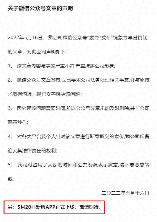 聲明稱,2022年5月16日,公司微信公眾號“象尋”發佈《祝象尋早日倒閉》的文章內容與事實嚴重不符,屬於嚴重抹黑公司形象。微信公眾號文章發佈後,已要求公司法務處理相關事宜,並與原技術取得溝通,現已妥善解決該問題。