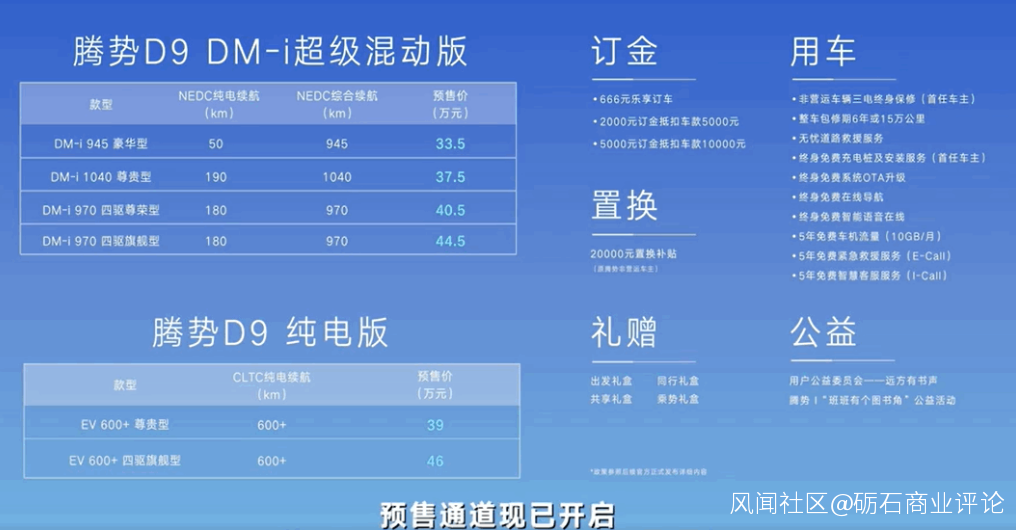 車型和售價上,騰勢D9共推出:4款DM-i超級混動版,預售價區間為33.5萬-44.5萬;兩款EV純電版,預售價區間為39萬-46萬;1款創始版,預售66萬,限量99台。