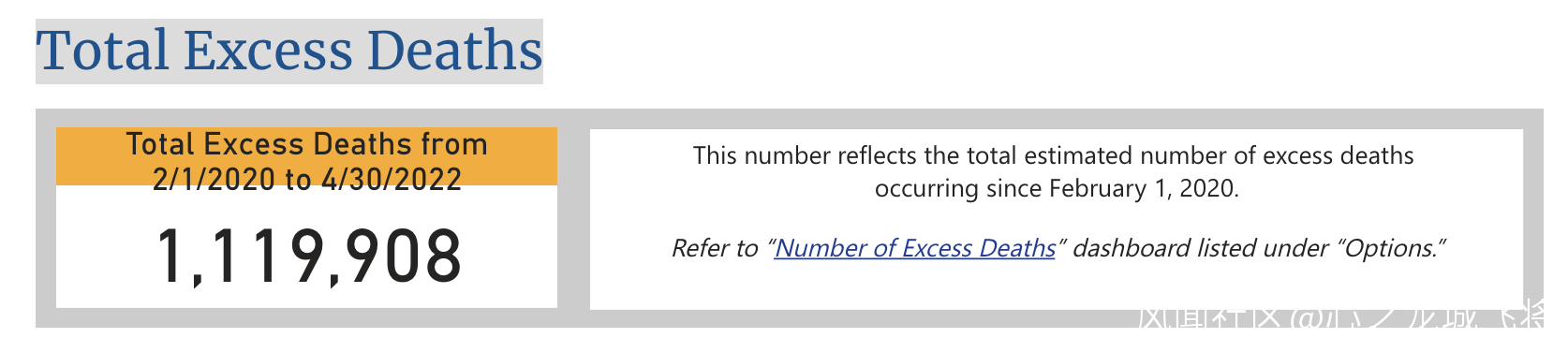 CDC數據還顯示,從2020年2月1日至2022年4月30日,美國總的超額死亡人數超過119萬人。