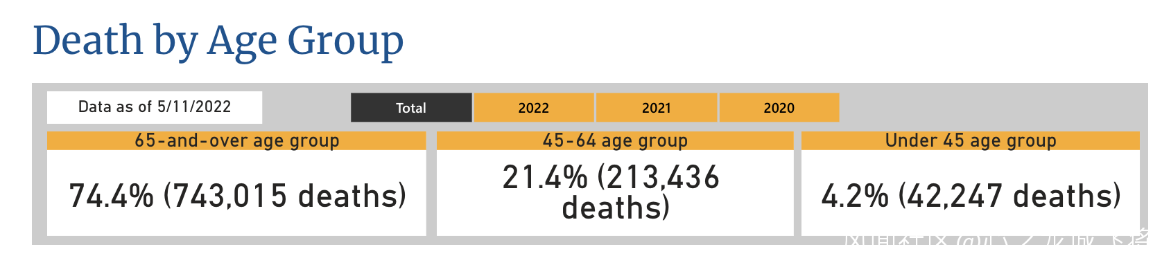 從死亡病例的年齡分佈來看,美國死亡的COVID-19感染者中,74.4%的是65歲及以上的老年人。不過,45-64歲年齡段的人羣死亡人數也超過21萬,佔21.4%。此外,小於45歲的青年和兒童死亡人數也超過4萬,佔4.2%。