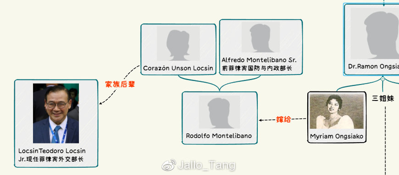 於是王沙哥家族就此繁衍生息下來,到第三代的時候拉蒙·王(Ramon Ongsiako)博士有三個美麗動人的女兒,在菲律賓媒體的描述中他們的容貌、家室和人生如同中國的宋氏三姐妹,其中之一桑德羅的奶奶Camencita****。而Camencita****的姐妹米莉安(Myriam)和伊梅爾達(Imelda)同樣嫁給了身世顯赫的家族。