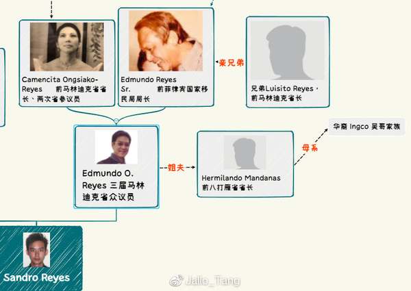 根據公開資料顯示,桑德羅Sandro的父母分別是埃德蒙多·雷耶斯Edmundo Ongsiako Reyes 和卡米拉·西松Camille Cepela Sison。我們先看他的母親卡米拉·西松Camille Sison 。她的父親名叫路易斯·西松Luis Sison,是一名律師,同時還曾擔任菲律賓國家建築公司(PNCC)的副主席,PNCC是菲律賓國\有獨資且是菲律賓最大的基建服務商,由此可見卡米拉Camille出身於一個家境非常殷實的家庭,同時,值得關注的是西松Sison家族與中國有着比較密切的關係。