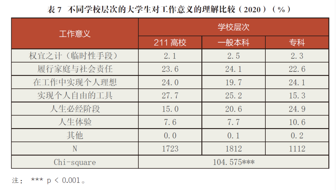 比較不同學校層次的大學生對工作意義的理解可以發現,211高校的大學生最看重工作作為“實現個人自由的工具”(27.7%),其次是“在工作中實現個人理想”(24.0%);一般本科的大學生最看重工作作為“實現個人自由的工具”(25.2%),其次是“履行家庭與社會責任”(24.1%);專科學校的大學生最看重工作作為“人生必經階段”(24.9%),其次是“在工作中實現個人理想”(24.1%)。由此可見,211高校的大學生最看重工作的精神價值;一般本科的大學生除了注重工作的精神價值之外,也注重履行家庭與社會責任;專科學校的大學生首先將工作作為生存的手段,其次才是追求工作的精神價值。