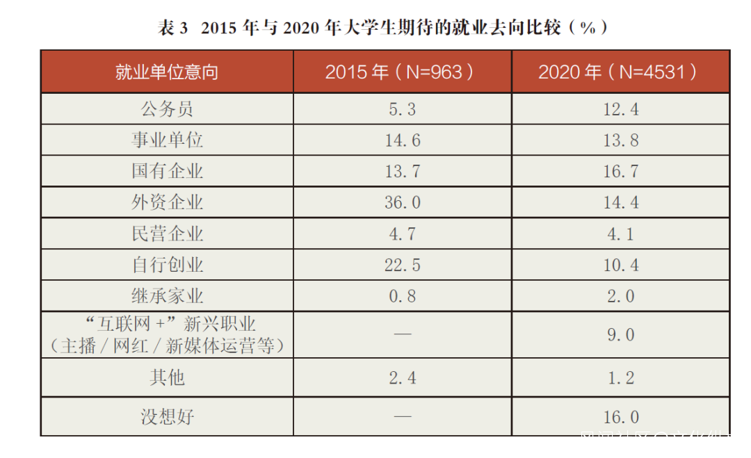 與2015年相比,2020年調查中大學生理想的就業去向呈現出以下三個特點:第一,選擇體制內就業的比例有較大上升,從2015年的33.6%上升到2020年的42.9%,尤其是選擇“公務員”的比例從5.3%上升到12.4%,説明體制內就業對大學生的吸引力的確在上升;第二,傾向於進入“外資企業”的比例大幅下降,從2015年的36.0%下降至2020年的14.4%;第三,選擇“自行創業”的大學生比例也大幅下降,從2015年的22.5%下降到2020年的10.4%。此外,值得關注的是,2020年的受訪大學生中有9.0%的人傾向於“互聯網+”新興職業(主播/網紅/新媒體運營等),説明這類新興就業方式對大學生也具有一定的吸引力。