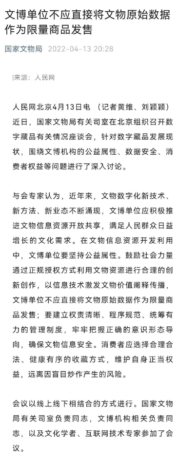 然後還是上個月,説是國家文物局開會,提出文博單位不應該直接將文物的原始數據作為限量商品發售。