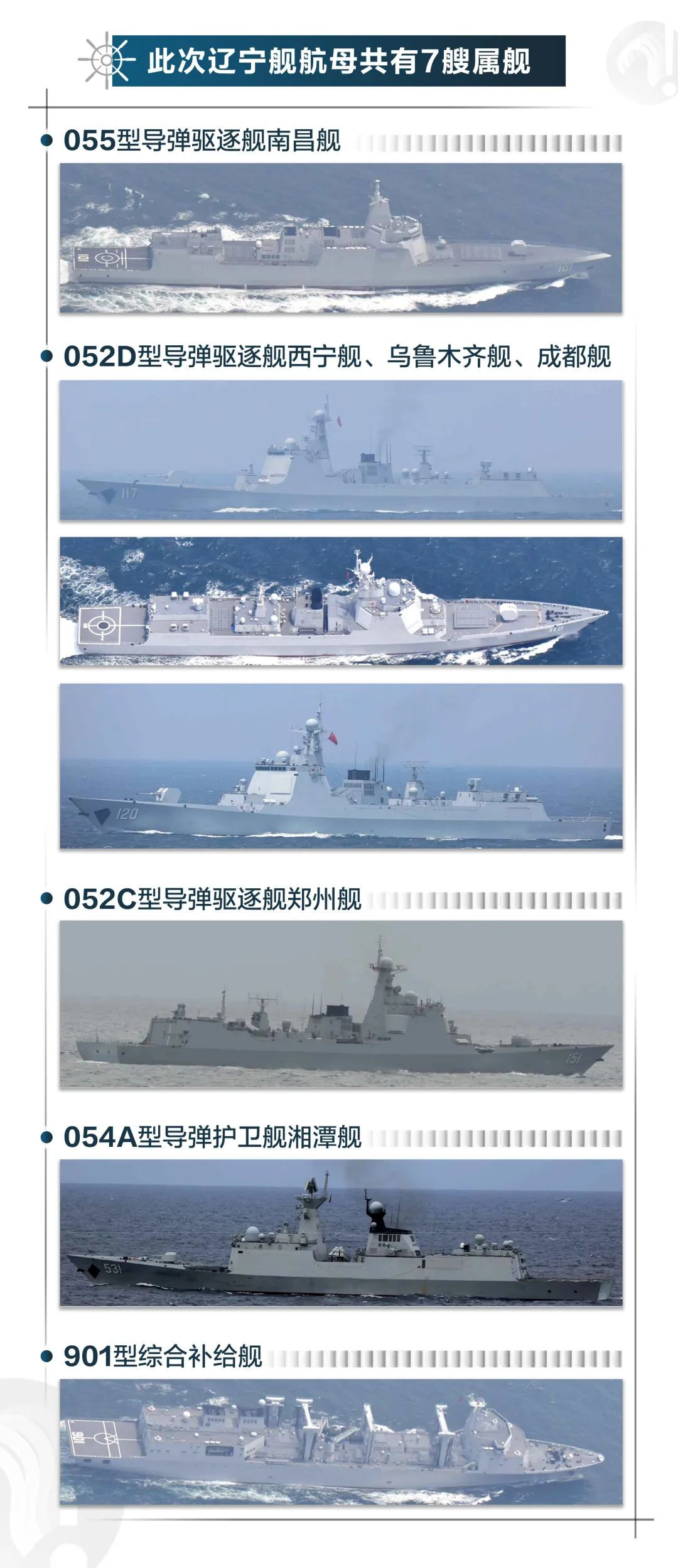 到了去年12月出海,遼寧艦配的是1艘055型驅逐艦、1艘052D型驅逐艦、2艘054A型護衞艦和1艘901型綜合補給艦,共5艘屬艦。