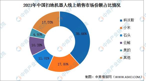 從2021年中國掃地機器人線上銷售渠道市場份額看,科沃斯作為中國掃地機器人的龍頭企業,近年來競爭實力持續增強,其2021年線上銷售佔整體的38.66%,排名第一,之後是小米(佔比17.8%)、石頭(佔比11.01%)、雲鯨(佔比10.38%)、美的(佔比4.6%)。線下銷售的市場份額中,科沃斯更是獨佔鰲頭,市場份額超過80%,第二名為美的,僅佔10.39%。