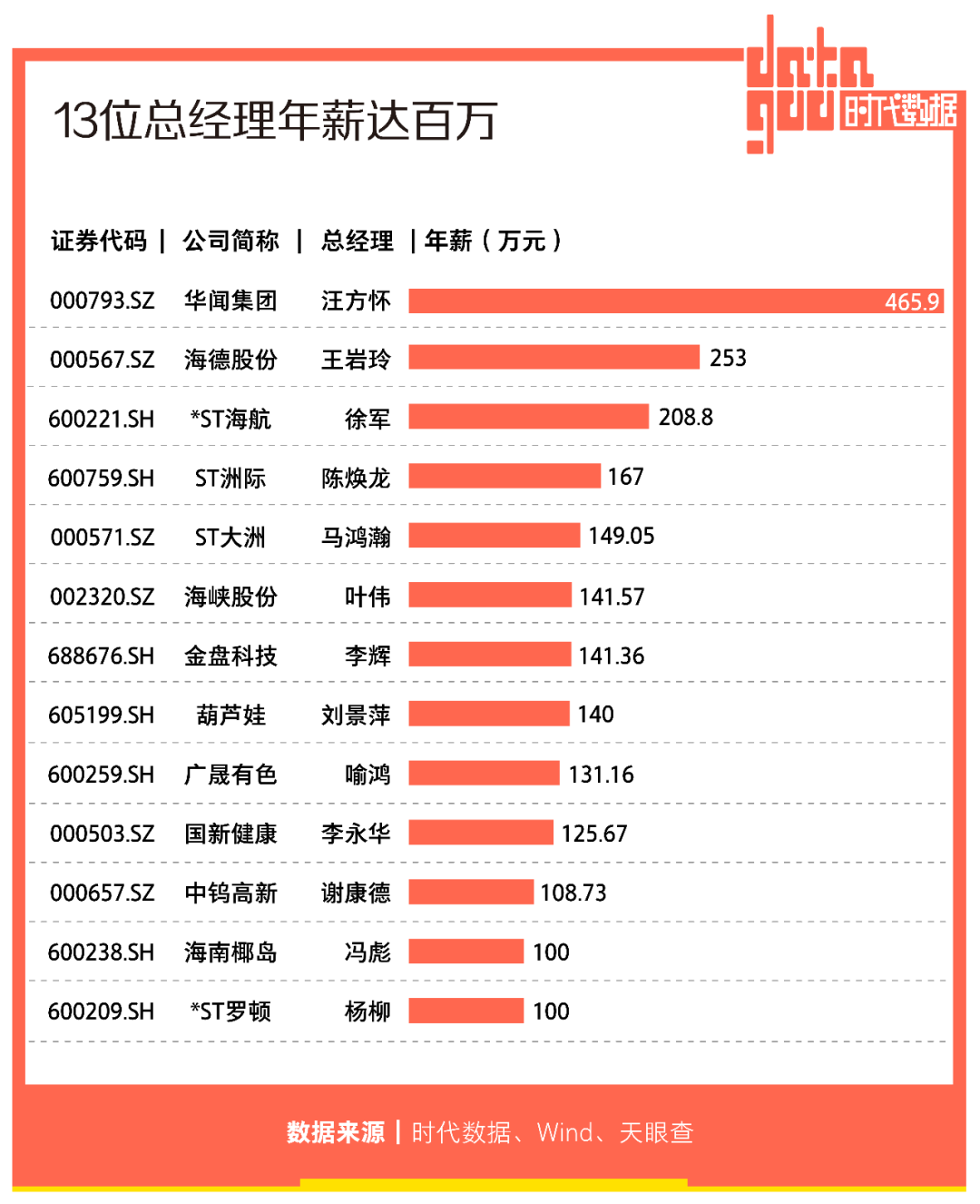 據時代數據統計,在這27家公司中,有13家公司的總經理2021年年薪達到100萬元。其中,華聞集團(000793)董事長兼總經理汪方懷年薪居首;海德股份(000567)總經理王巖玲以253萬元年薪緊隨其後;其後,*ST海航(600221)總經理徐軍以208.8萬元年薪排在第三。