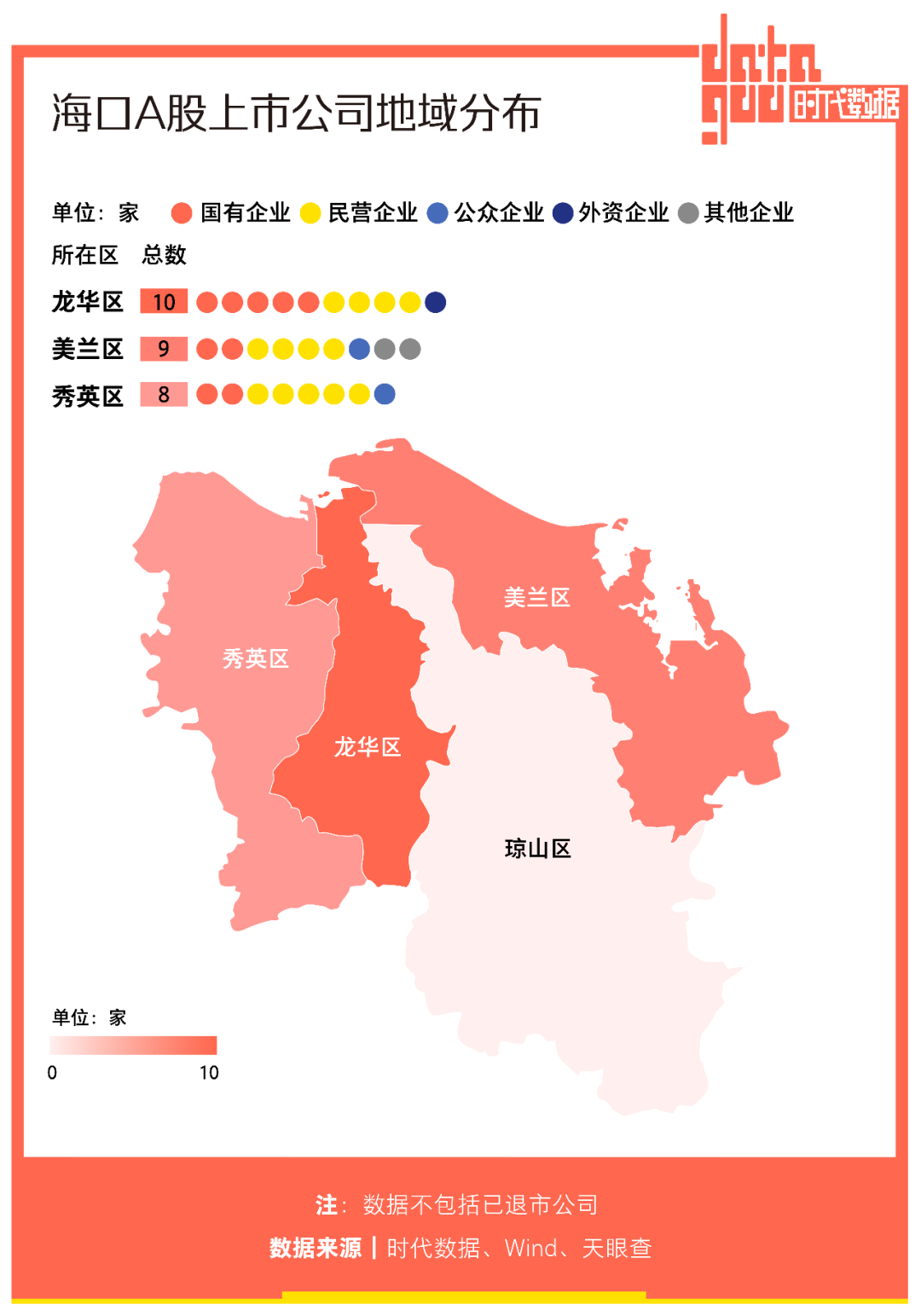 從上市公司地域分佈來看,龍華區聚集的上市公司居多,達到10家;其中,國有企業5家、民營企業4家、外資企業1家。其後,美蘭區以9家上市公司位居第二;秀英區以8家上市公司位居第三。