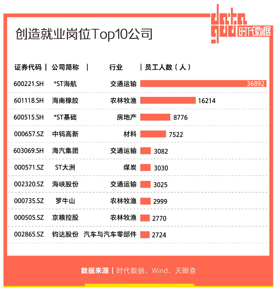 其中,國內領先的航空公司、剛剛完成破產重整的*ST海航(600221)創造的就業崗位居首,接近3.7萬個。其後,國內天然橡膠行業領先企業海南橡膠(601118)擁有員工1.62萬人,位居第二;最近完成債務重整的*ST基礎(600515)擁有員工8776人,位居第三。