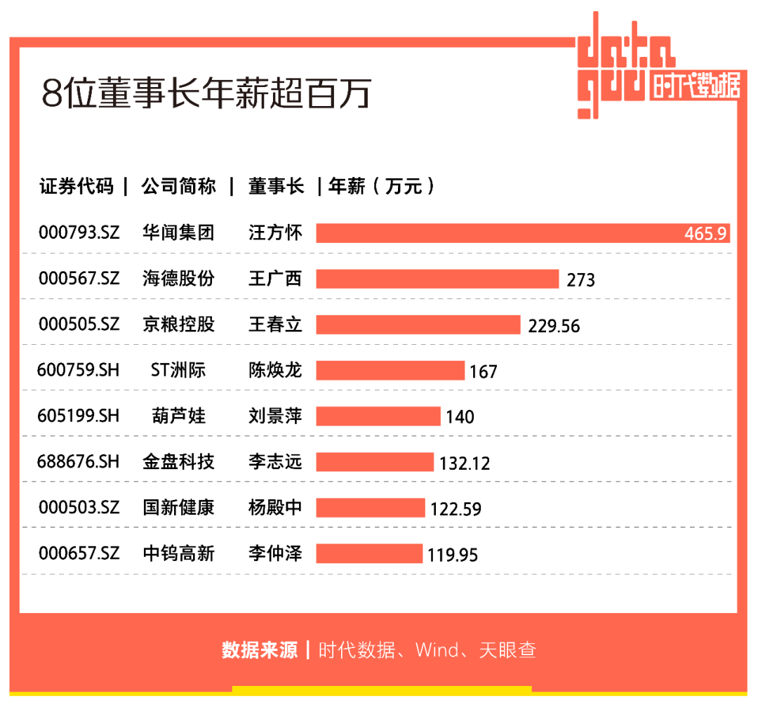 據時代數據統計,在這27家公司中,有8家公司的董事長2021年年薪超過100萬元。其中,最高的是華聞集團(000793)董事長兼總經理汪方懷,年薪465.9萬元;其次是海德股份(000567)董事長王廣西,年薪273萬元;京糧控股(000505)董事長王春立以229.56萬元年薪位居第三。