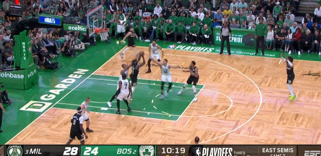 所以這種不斷強轉弱進三分的情況下,綠軍不只投進了22記三分,還送出了29個助攻。其中斯瑪特、塔圖姆和霍福德加起來24個,前兩者是外線擋拆的持球發起人,霍福德是擋拆掩護人和接應點。