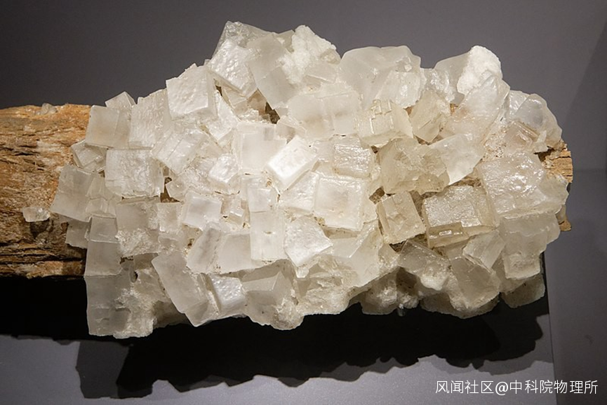長在木頭上的石巖(岩鹽礦)以多晶的形式結晶,表現出立方對稱性。岩鹽礦(氯化鈉)結構屬於立方晶系,空間羣為Fm-3m。來源