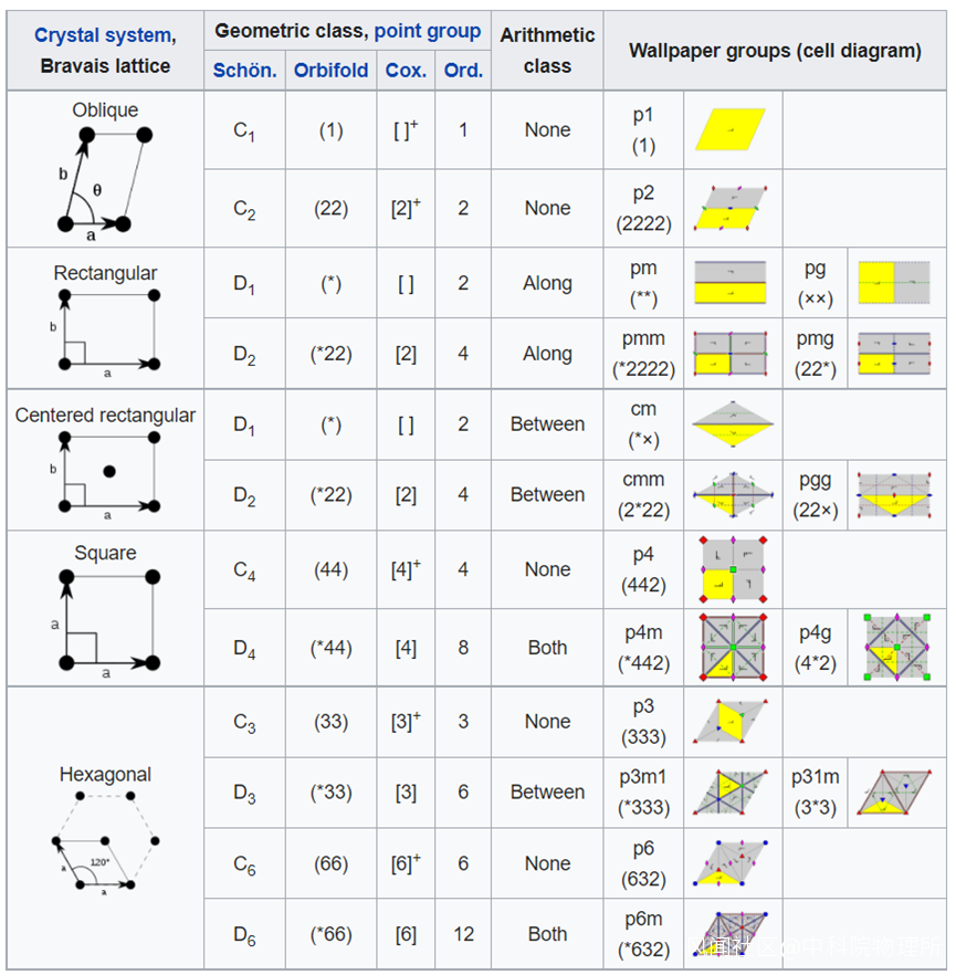 17種可能的牆紙羣(wallpaper group)由所有可能的點羣對稱性操作(可以伴隨平移操作)獲得。來源