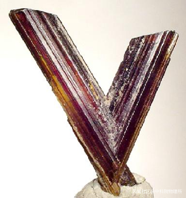 屬於四方晶系的金紅石孿晶(二氧化鈦),其空間羣為P42/mnm。來源