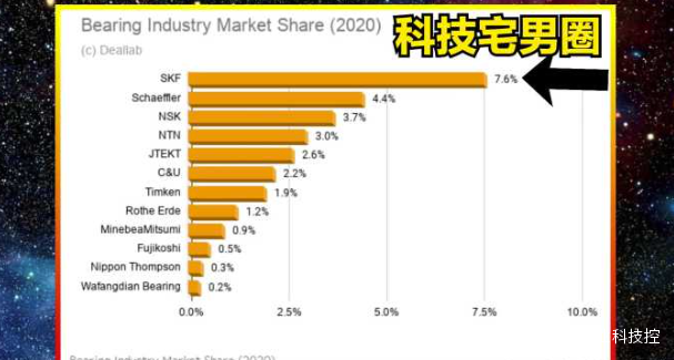 再給大家説一下2020年,世界軸承企業市場份額排行榜。瑞典斯凱孚排名第一,佔7.6%,德國舍弗勒排名第二,佔4.4%,日本NSK排名第三,佔3.7%,中國人本C&U排名第六,佔2.2%,中國瓦房店排名第十二位,佔0.2%。