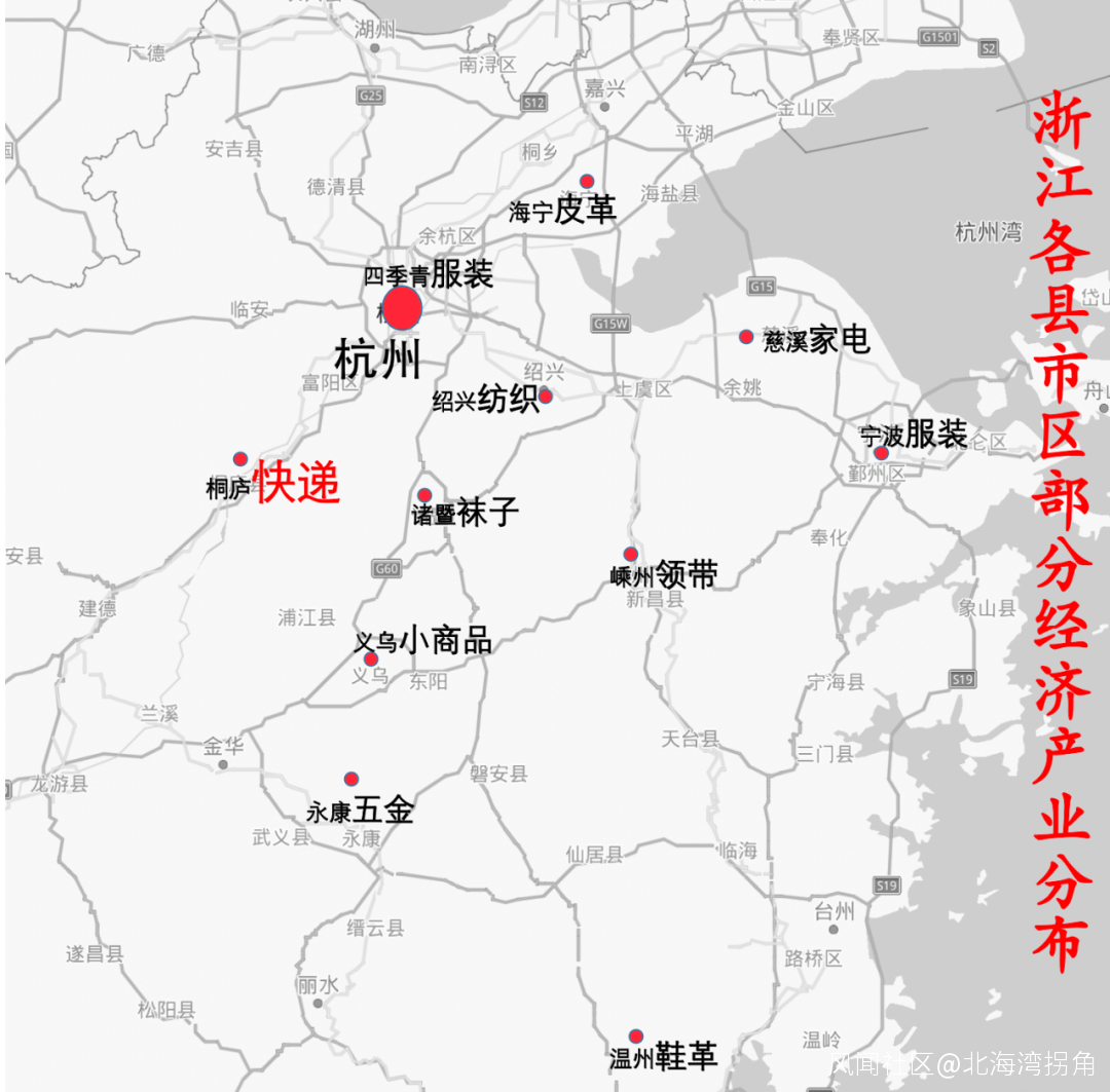 除此之外,還有比如海寧的皮革、温州的鞋革、諸暨的襪子、嵊州的領帶、桐廬縣強大的快遞公司