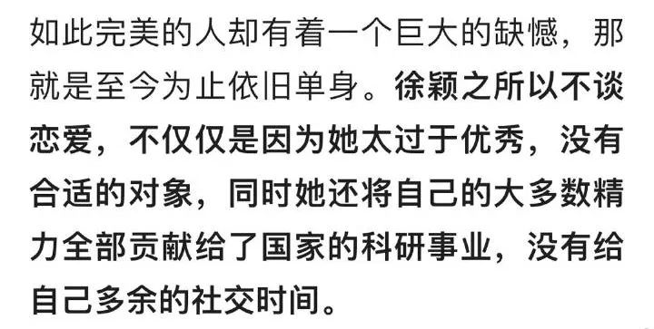 而投身科研,沒時間戀愛的她,卻被人評價“單身是徐穎巨大的缺憾”。