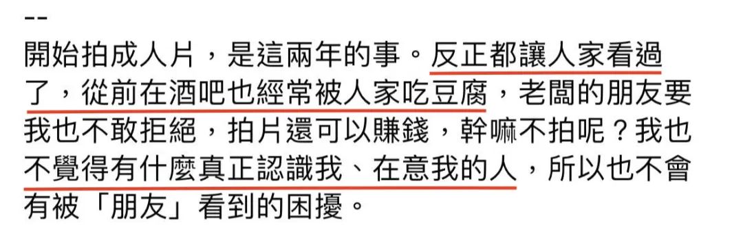 “反正都讓人看過了,從前也經常被人吃豆腐。我也不覺得有什麼真正在意我的人。”