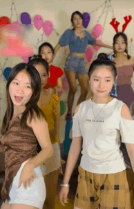 這次她不再置身山野,而是站在一羣穿着清涼火辣的女孩之中,學她們性感地扭腰翹臀,手腳侷促地跳着女團舞。